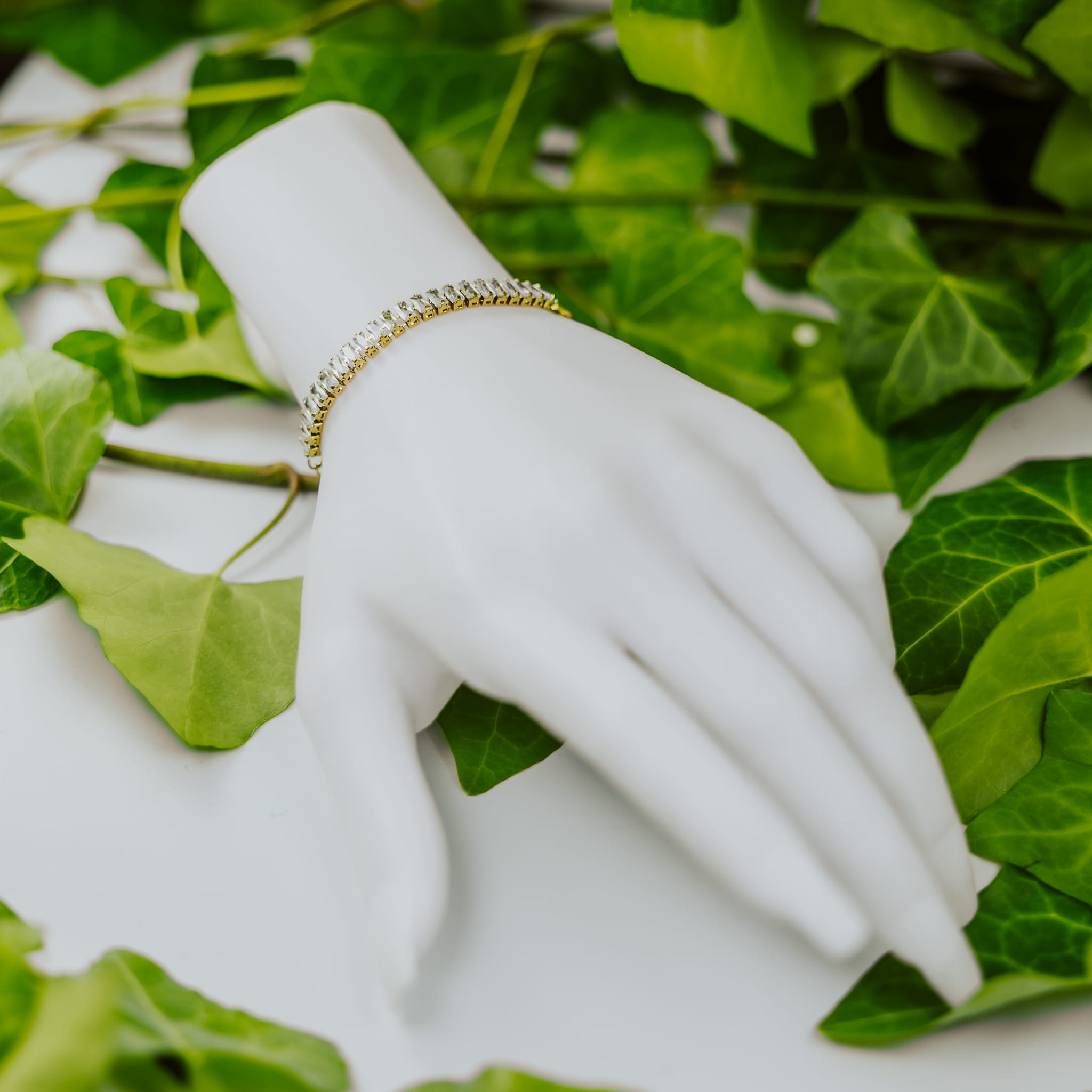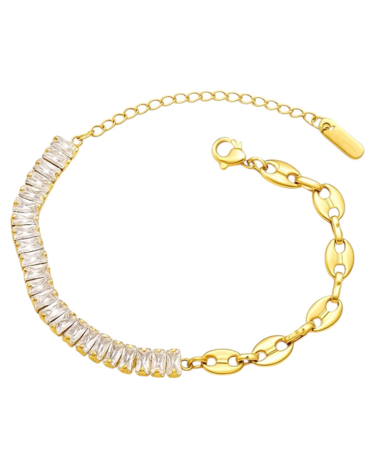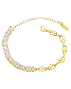 Pełna blasku i elegancji, ta pozłacana bransoletka przyciąga wzrok subtelnym połyskiem cyrkonii o szlifie baguette. Ich geometryczny układ podkreśla nowoczesny charakter biżuterii, a złote ogniwa dodają jej klasy i stylu. Doskonała na co dzień i na specjalne okazje – to detal, który zamienia każdą stylizację w pełną szyku.
