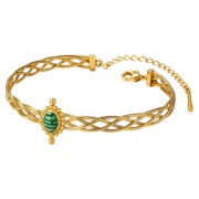 Wyjątkowa bransoletka, w której misternie splecione złote pasma tworzą delikatną, a jednocześnie wyrazistą kompozycję. Centralnym punktem jest owalny, zielony kamień o subtelnych, naturalnych refleksach – symbol równowagi i harmonii. Detal w stylu vintage nadaje jej królewskiego charakteru, dzięki czemu bransoletka pięknie podkreśla każdą stylizację – od codziennej po wieczorową.