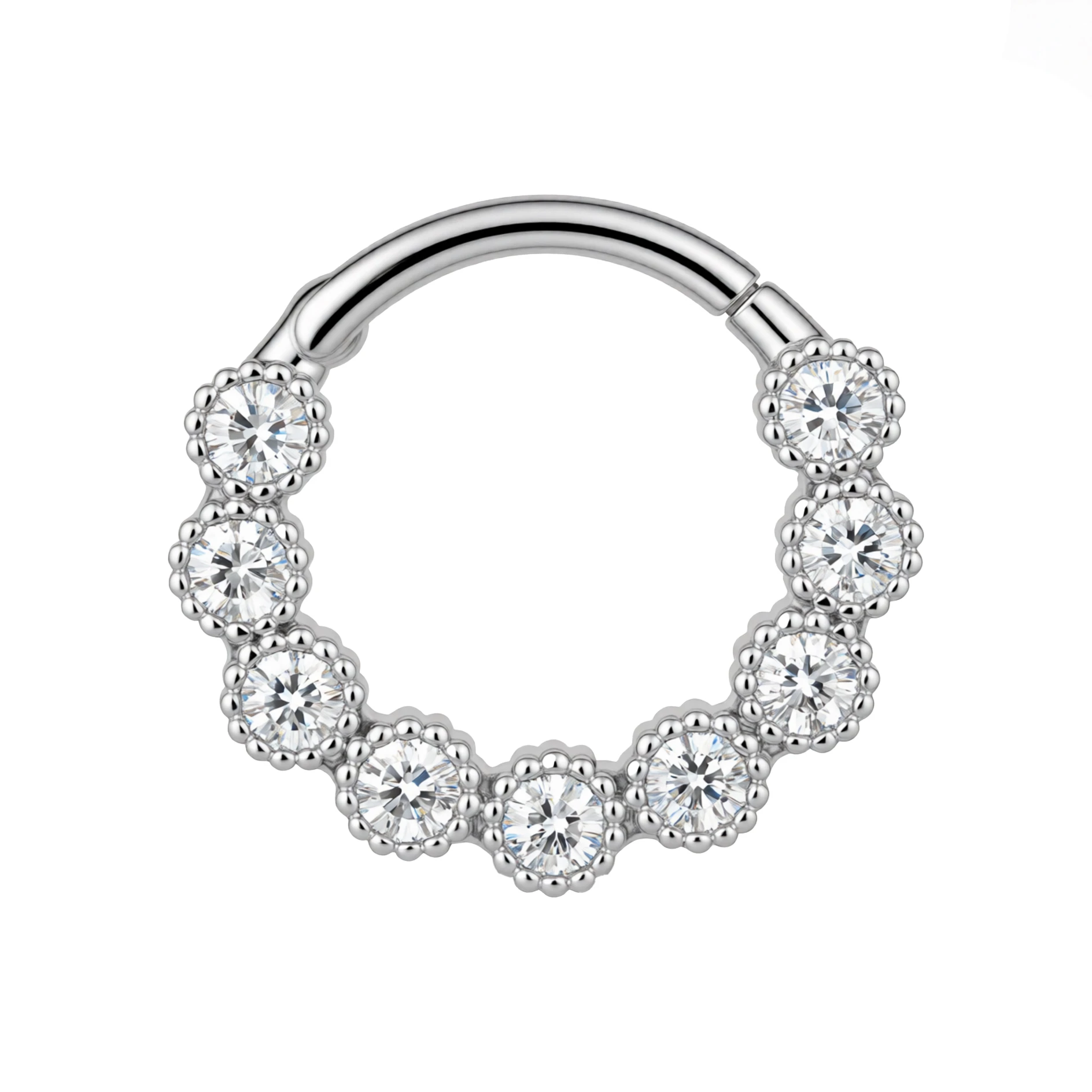 Elegancki, kobiecy i zachwycający detalami. Ten srebrny clicker wykonany ze szlachetnego srebra 925 mieni się szeregiem perfekcyjnie oszlifowanych cyrkonii, z każdą osadzoną w subtelnej, koronkowej oprawie przypominającej płatki kwiatów. To biżuteria, która łączy klasykę z romantycznym akcentem – idealna dla osób kochających delikatny blask i wyrafinowaną estetykę.