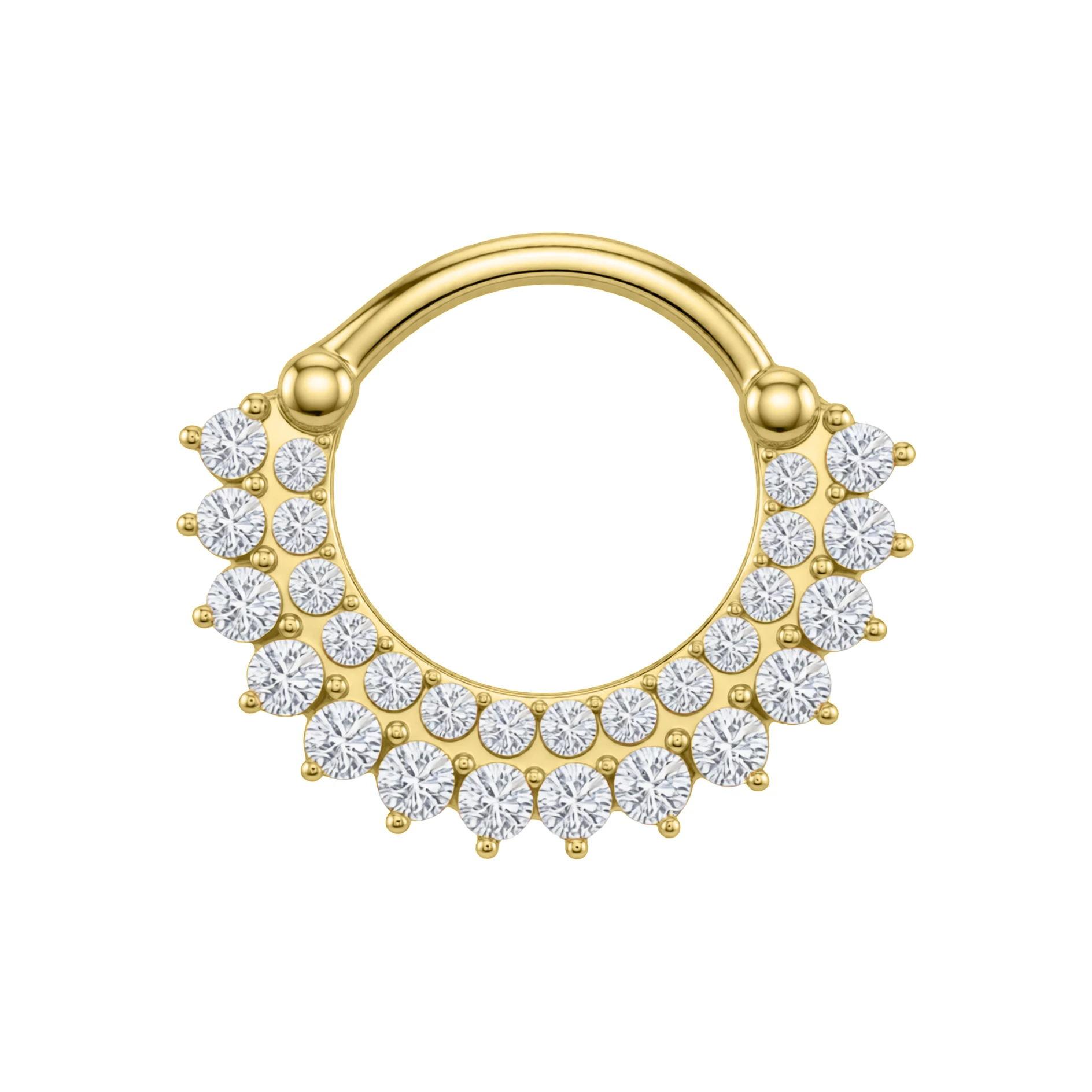 Ten wyjątkowy clicker wykonany z srebra próby 925 to połączenie elegancji i wyrafinowanego blasku. Drobne, misternie osadzone cyrkonie tworzą kaskadowy wzór przypominający diamentową koronę, która otula światło przy każdym ruchu.