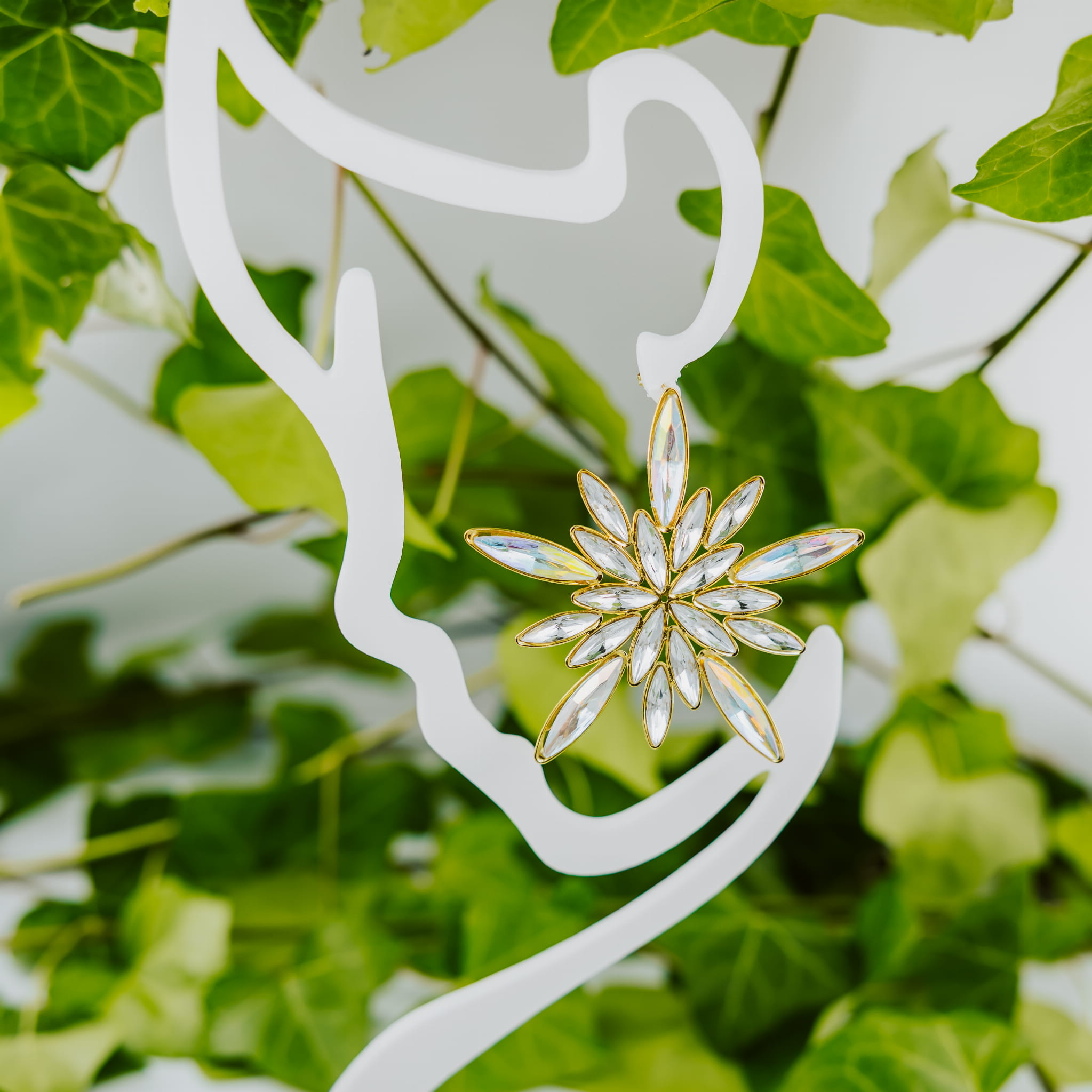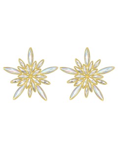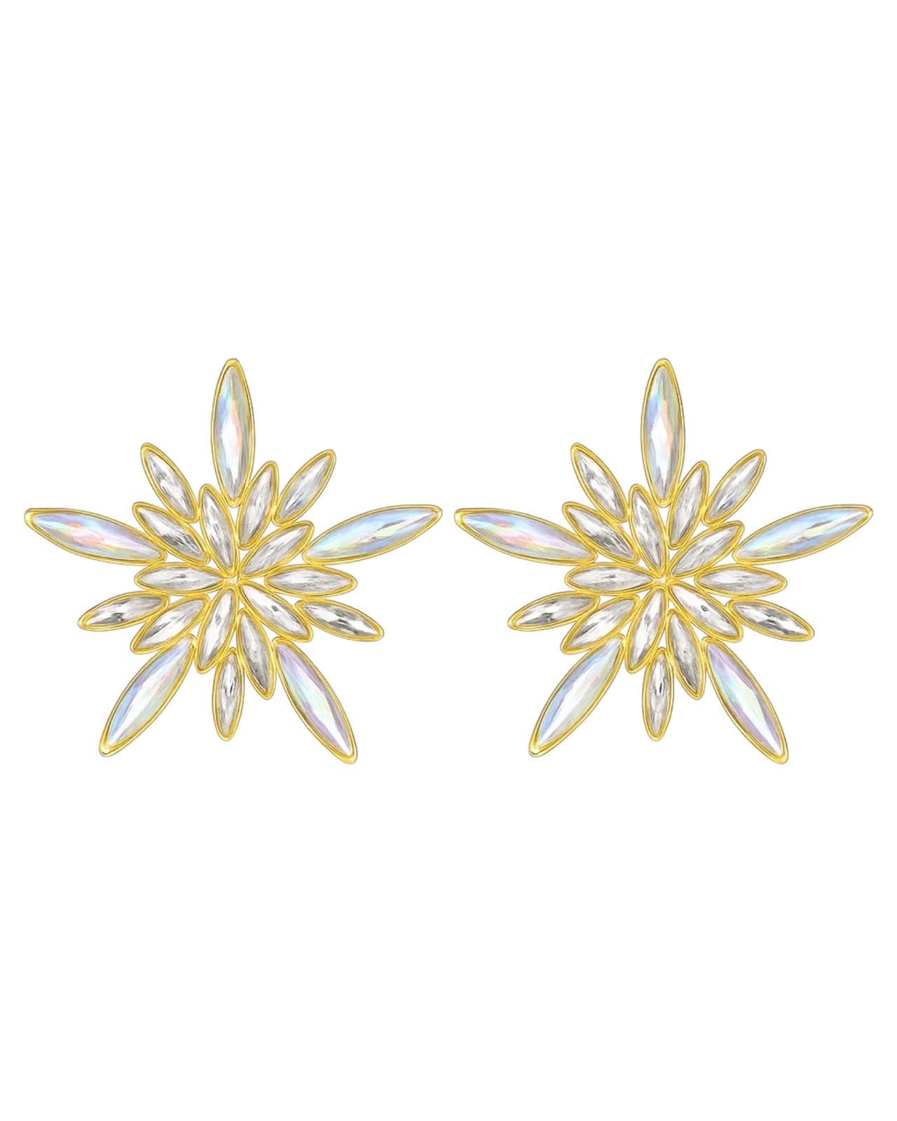Te kolczyki to prawdziwa biżuteryjna gwiazda – dosłownie i w przenośni. Zaprojektowane w kształcie świetlistej rozety, złożonej z długich, smukłych kryształów o tęczowej poświacie, tworzą zachwycającą kompozycję, która od razu przyciąga wzrok. Każdy element został precyzyjnie oprawiony w eleganckie złote wykończenie, dzięki czemu całość wygląda luksusowo, a jednocześnie lekko i nowocześnie.