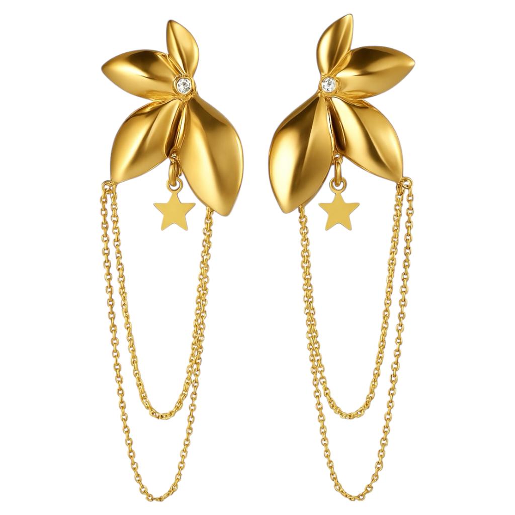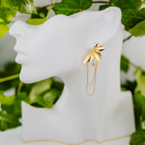 Zjawiskowe kolczyki w kształcie liści, z których zwisają subtelne łańcuszki i zawieszki w formie gwiazdek – niczym połączenie leśnej magii z nocnym niebem.