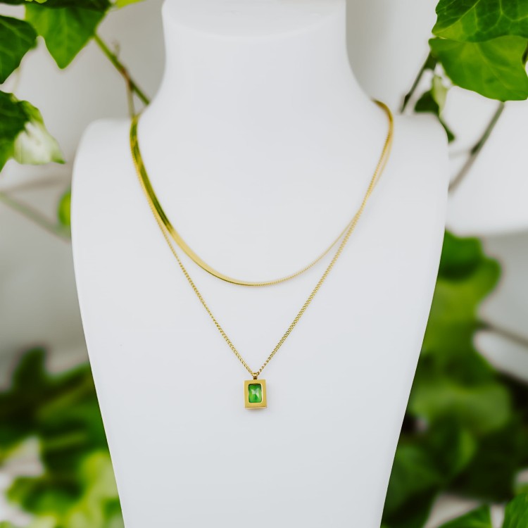 Zmysłowe połączenie dwóch łańcuszków – gładkiej, złotej taśmy o subtelnym połysku i delikatnego splotu z zawieszką w głębokiej zieleni. Geometryczny kamień w złotej oprawie symbolizuje równowagę i pewność siebie, a jego kolor przywołuje spokój natury i luksusową świeżość.
