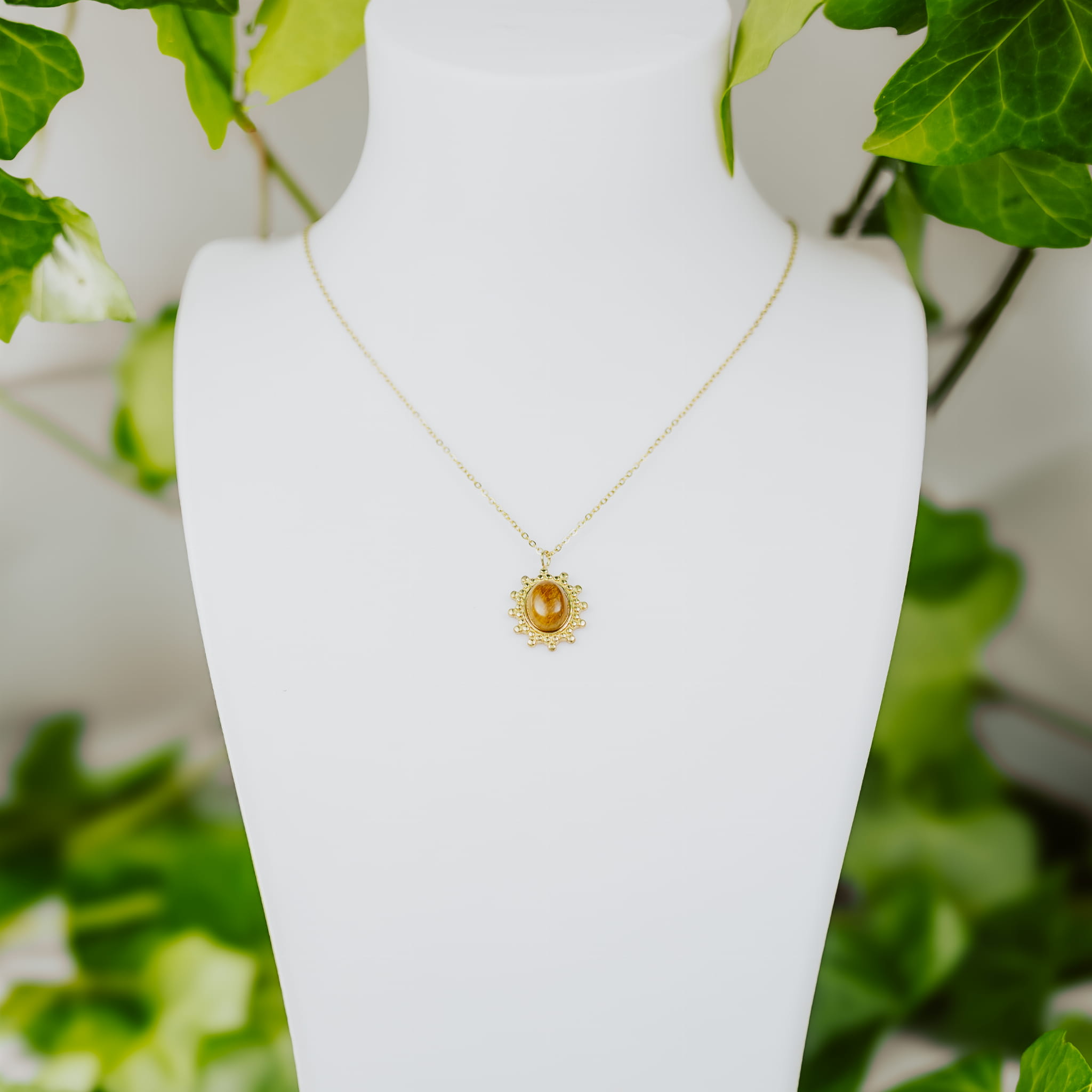 W centrum tej złotej kompozycji pulsuje kamień – tygrysie oko. Symbol odwagi, skupienia i wewnętrznej mocy. Oprawiony w delikatnie zdobioną ramę, naszyjnik przywodzi na myśl amulet. Osobisty talizman dla kobiety, która ufa swojej intuicji.