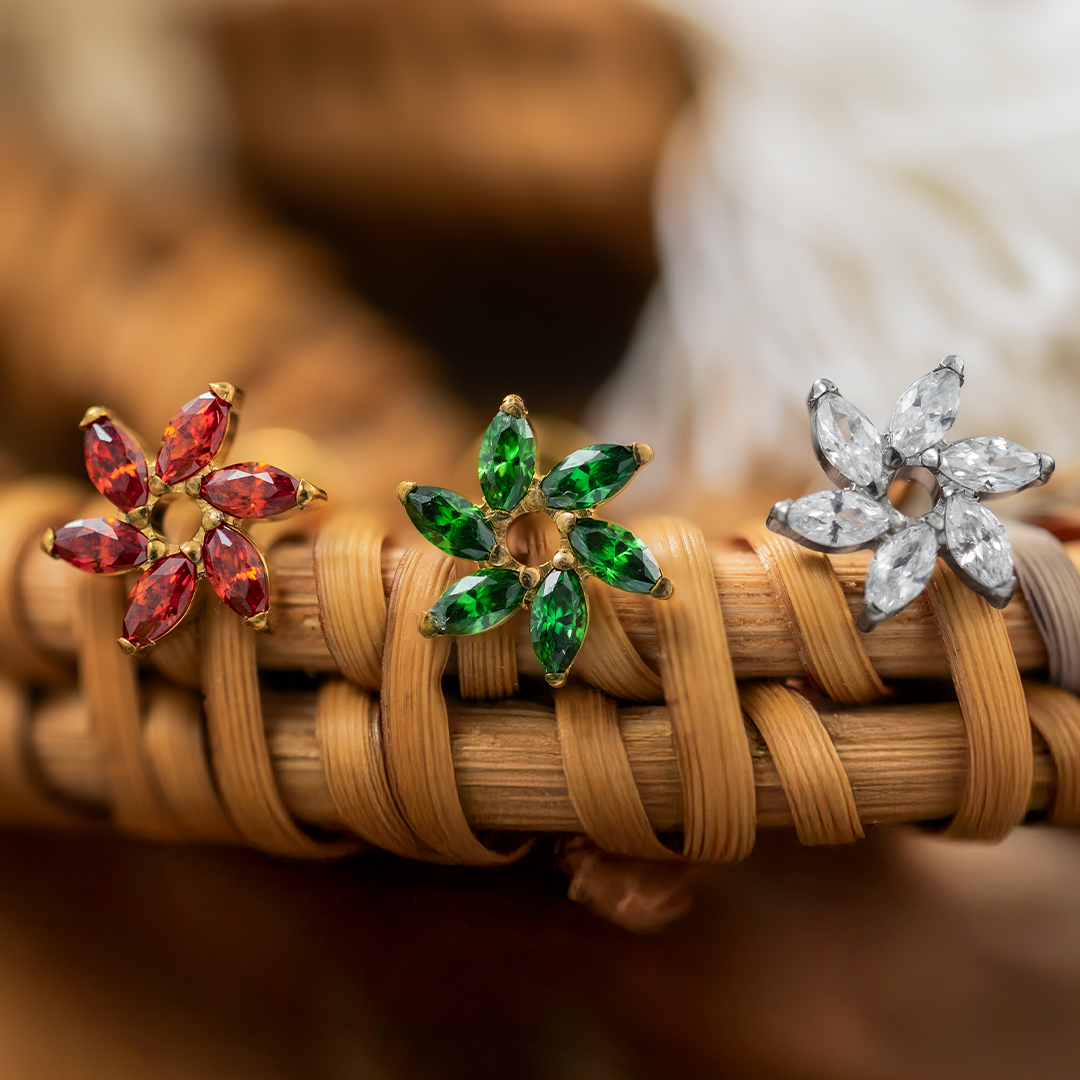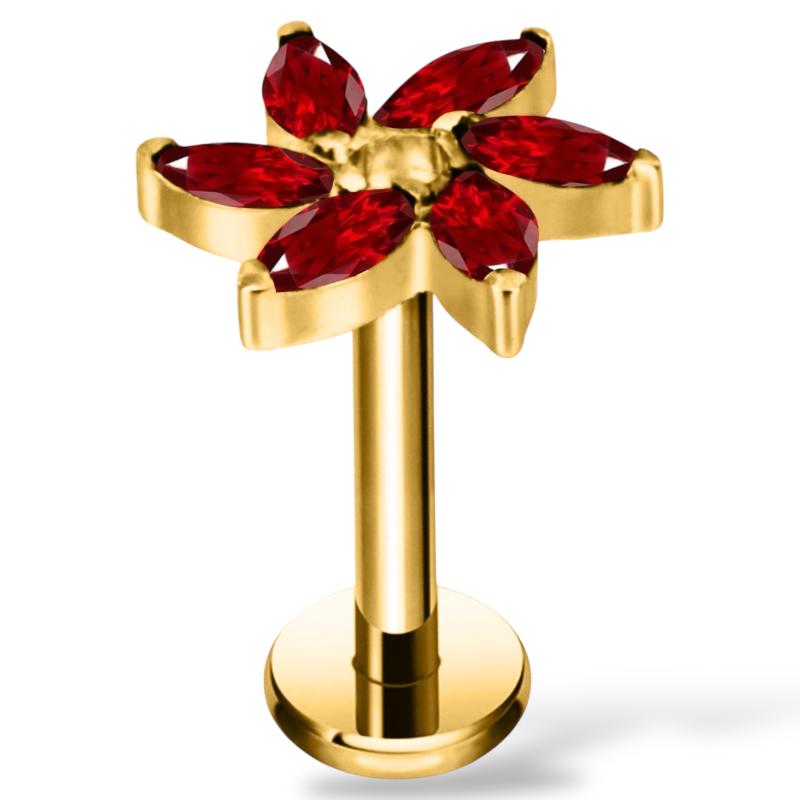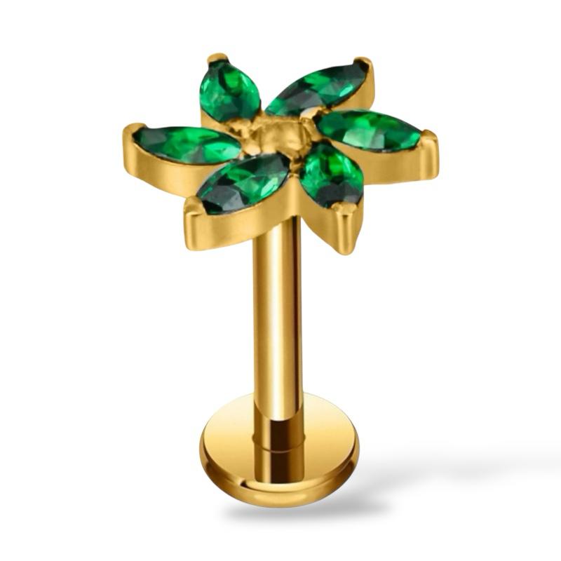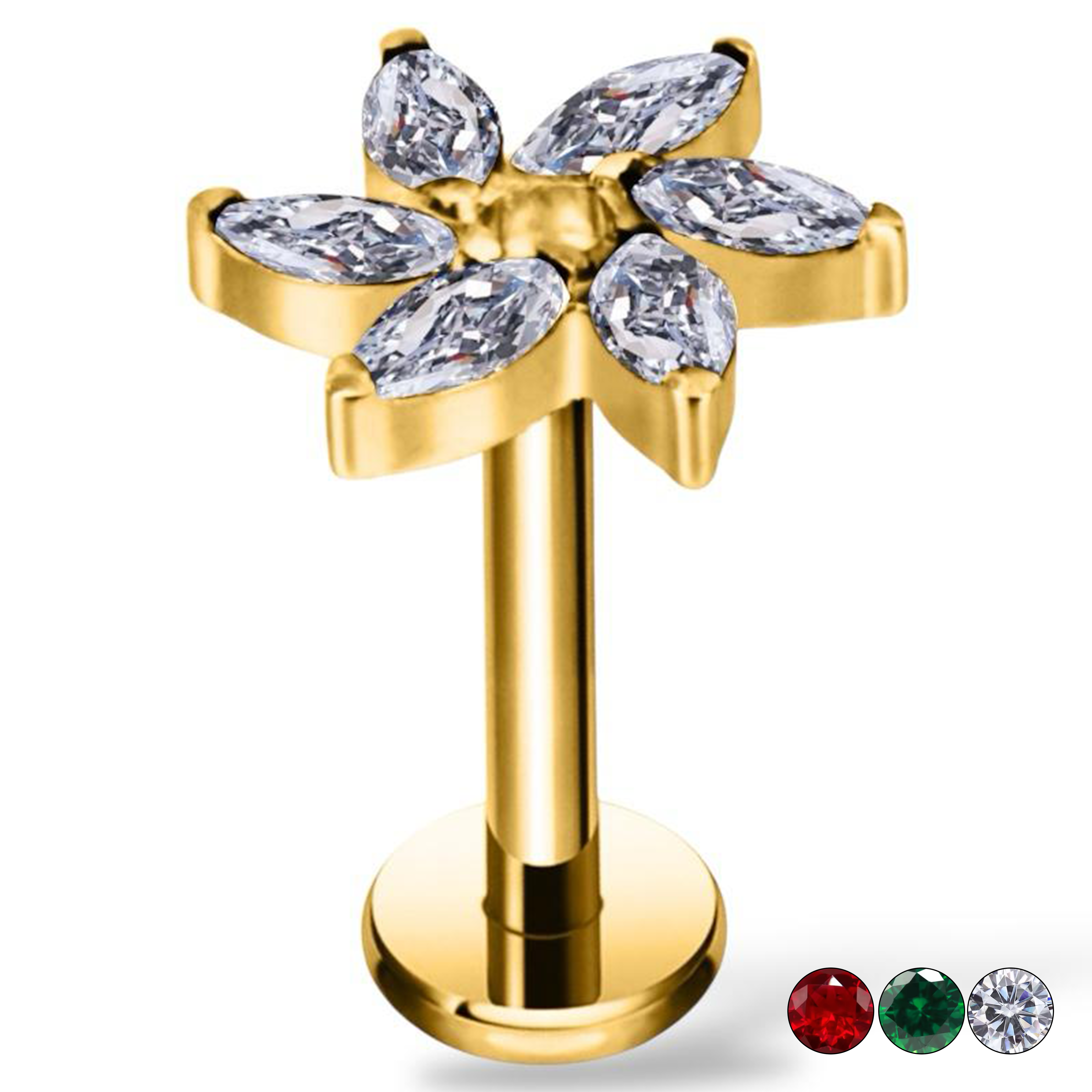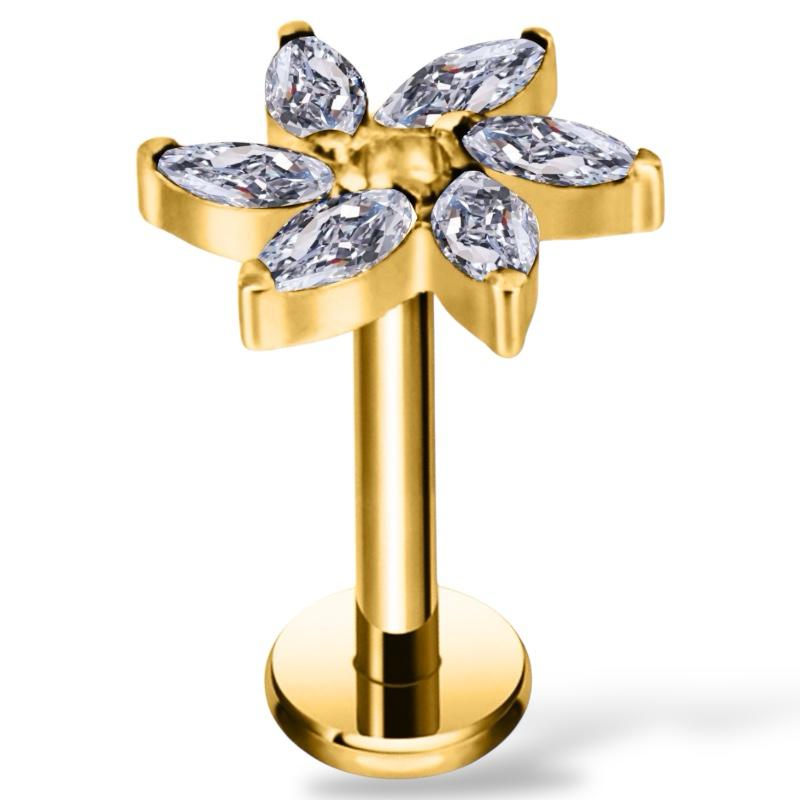 Tytanowy złoty labret z motywem kwiatu z cyrkoniami