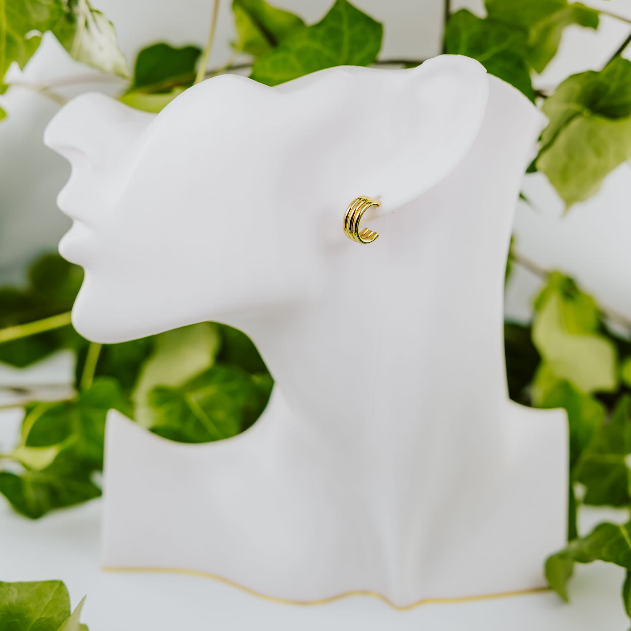 Minimalistyczne, a jednocześnie pełne charakteru. Ich geometryczna, trójwarstwowa forma przyciąga spojrzenia i nadaje stylizacji luksusowego akcentu. Wykonane z polerowanej stali szlachetnej w kolorze złota, lśnią z każdym ruchem, podkreślając indywidualny styl właścicielki.